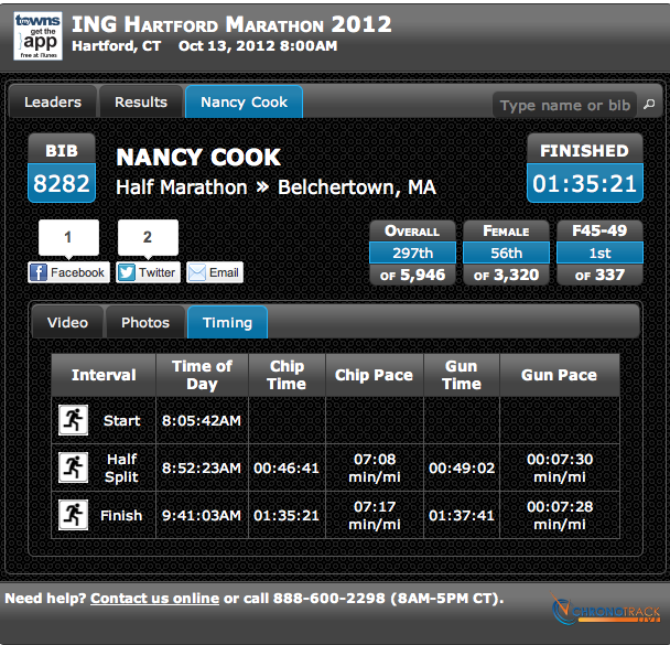 The finish is the best – you get over that hump of feeling like you lost your PR and then you realize it is time to kick it in. I love all the crowds cheering like you the rockstar of the day — then to hear your name on the loudspeaker! Yay me! Another great race and a post cancer PR! I ran a 1:38:38 in the Stratton Faxton Half Marathon in June and didn’t place in my age — so I wasn’t sure what fast girls may have shown up here today.