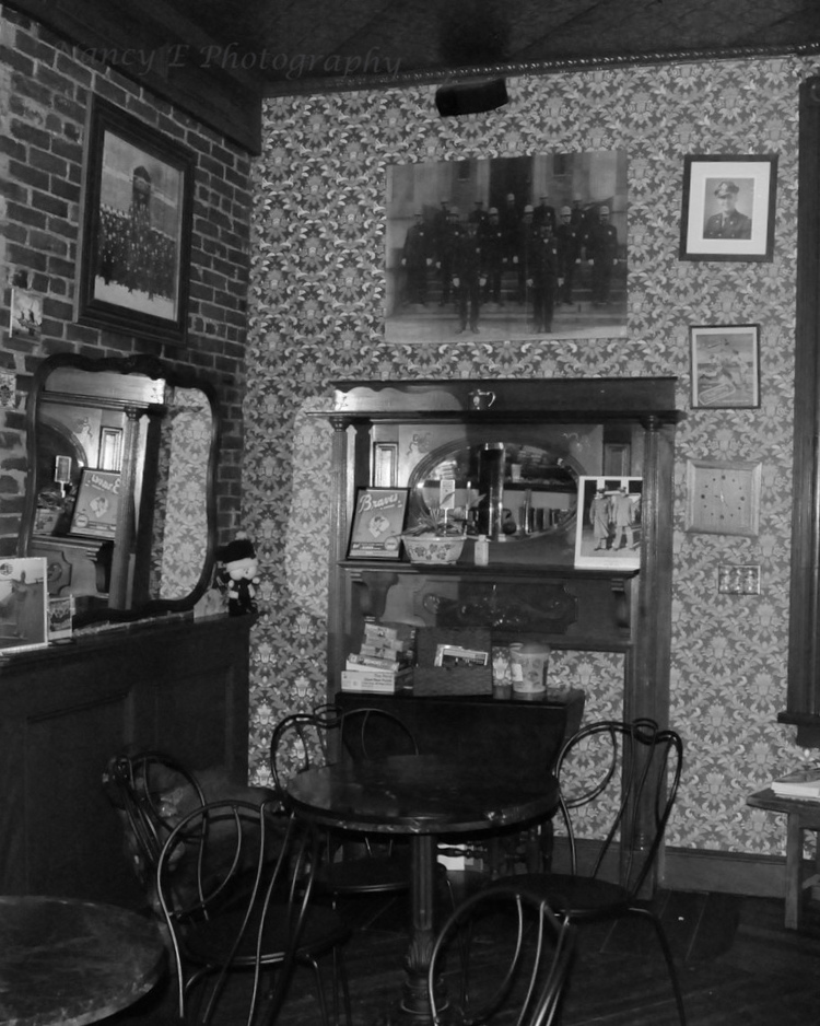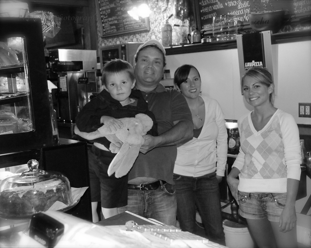 On our recent trip to Boston we had the opportunity to venture to South Boston where we stayed at the Doubletree on the Bay.  It was nice to get some photos of the streets of Boston and in the morning we went to the Bay for some more photography.  Although I wasn’t feeling very well, and the weather was quite gloomy I was able to get some good photos.  My favorites were of the “Sugar Bowl”.  We were on a quest for ice cream for dessert after dinner at the Boston Beer Garden.  “Sarah” our GPS (we named her Sarah after the talking “house” on the Scy Fy TV series Eureka) gave us directions for Brighams…. and we headed into Dorcester, the streets were dark, except for a light on the corner showing us the Sugar Bowl — which Samantha recognized and we decided to stop.  The welcoming atmosphere and old time bakery / cafe feeling was something like you would see in the North End in Boston.  I loved the lighting on the sign and decided to take out my camera.  The interior cafe tables and old black & white photos depicting life in the 1700’s hung in the corner of the cafe.  There was a big room with cushy chairs and free wifi in the back.  What a sweet place.  The Brigham’s ice cream was fabulous and worth the stop!  We were fortunate to meet the owner (Bob) and his son who was playing with his stuffed bunny in the store (so cute!).  I took a group photo of the 2 of them with the cafe girls.  He thought I was from the Boston Globe and would make him famous.  Maybe I should send something in freelance! You have to love the warmth of the Irish! 🙂  IN the meantime it is fun to feature this experience on my blog.