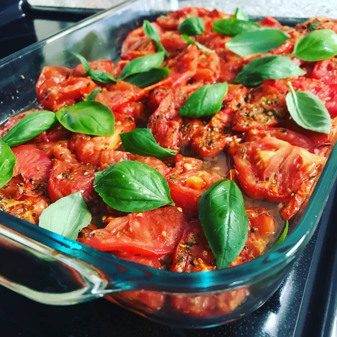 Ingredients: Fresh Tomatoes (6), Fresh Garlic (2 TBSP), Fresh Basil (15 leaves), Coconut oil spray, Oregano (I love to use Penzey\’s Turkish Oregano