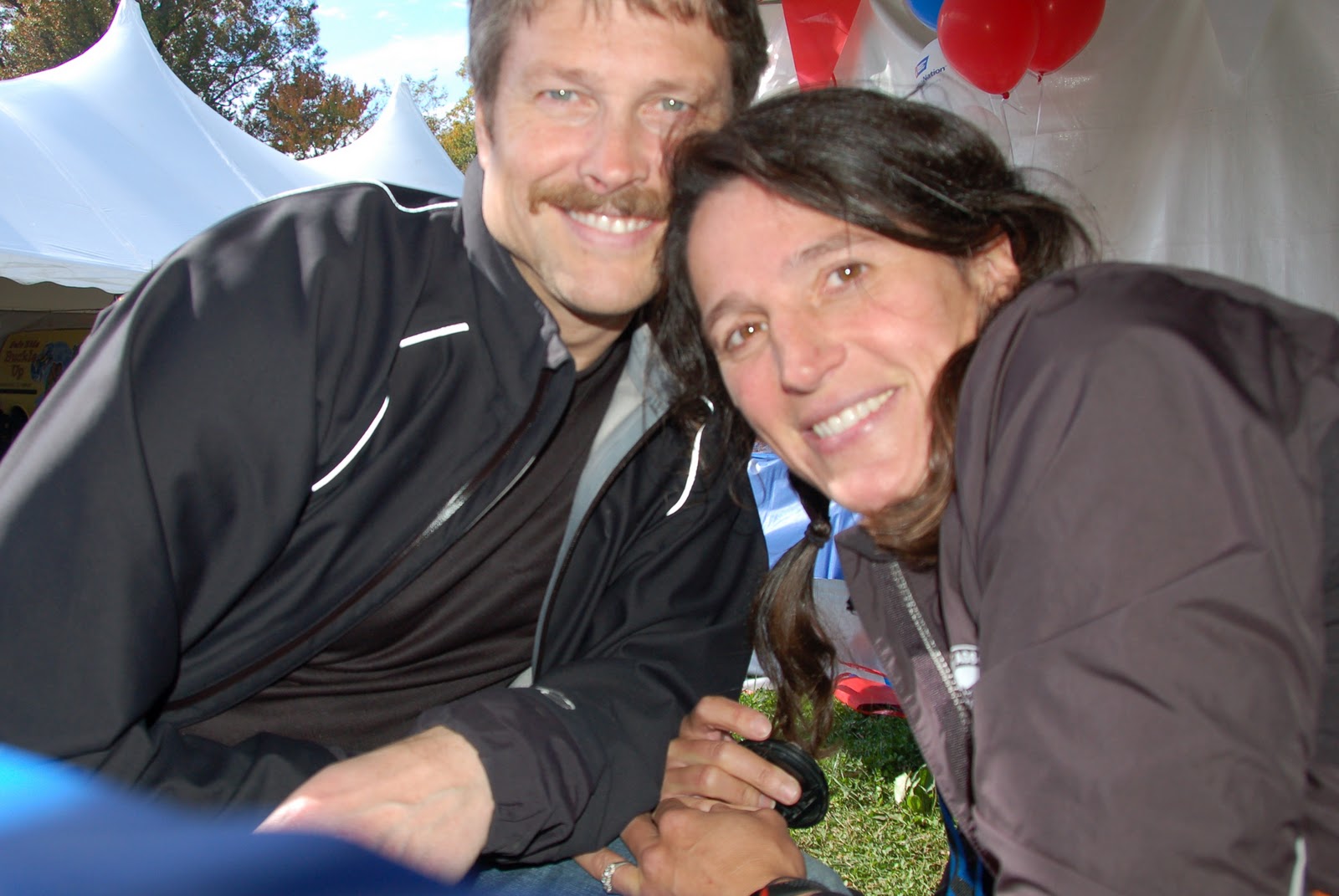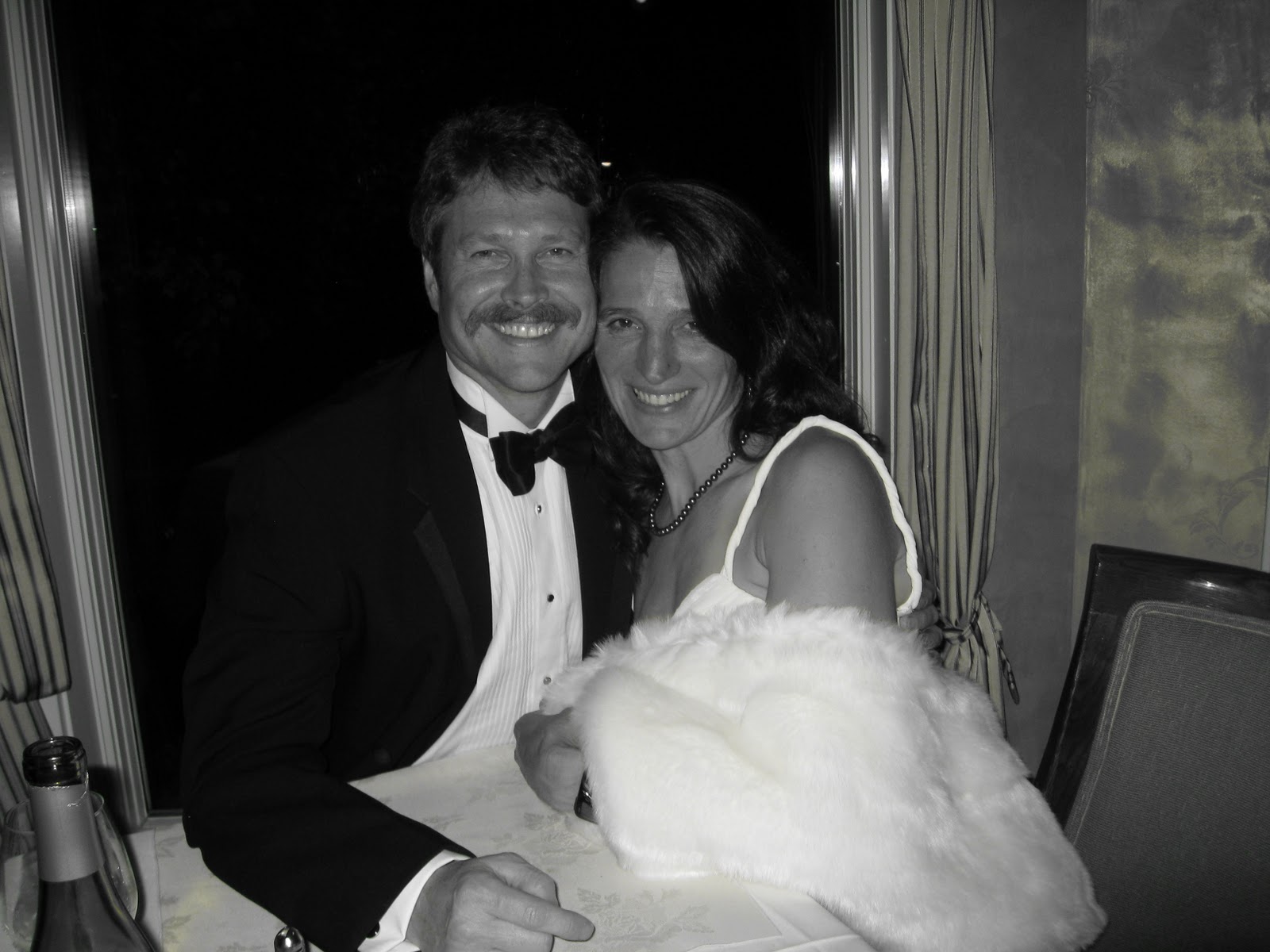 For our first and second wedding anniversary dinners we dressed up in our wedding clothes. This photo is from October 20, 2009. Love the dress and the little white fur. 🙂 Still looking as great together as we always have!