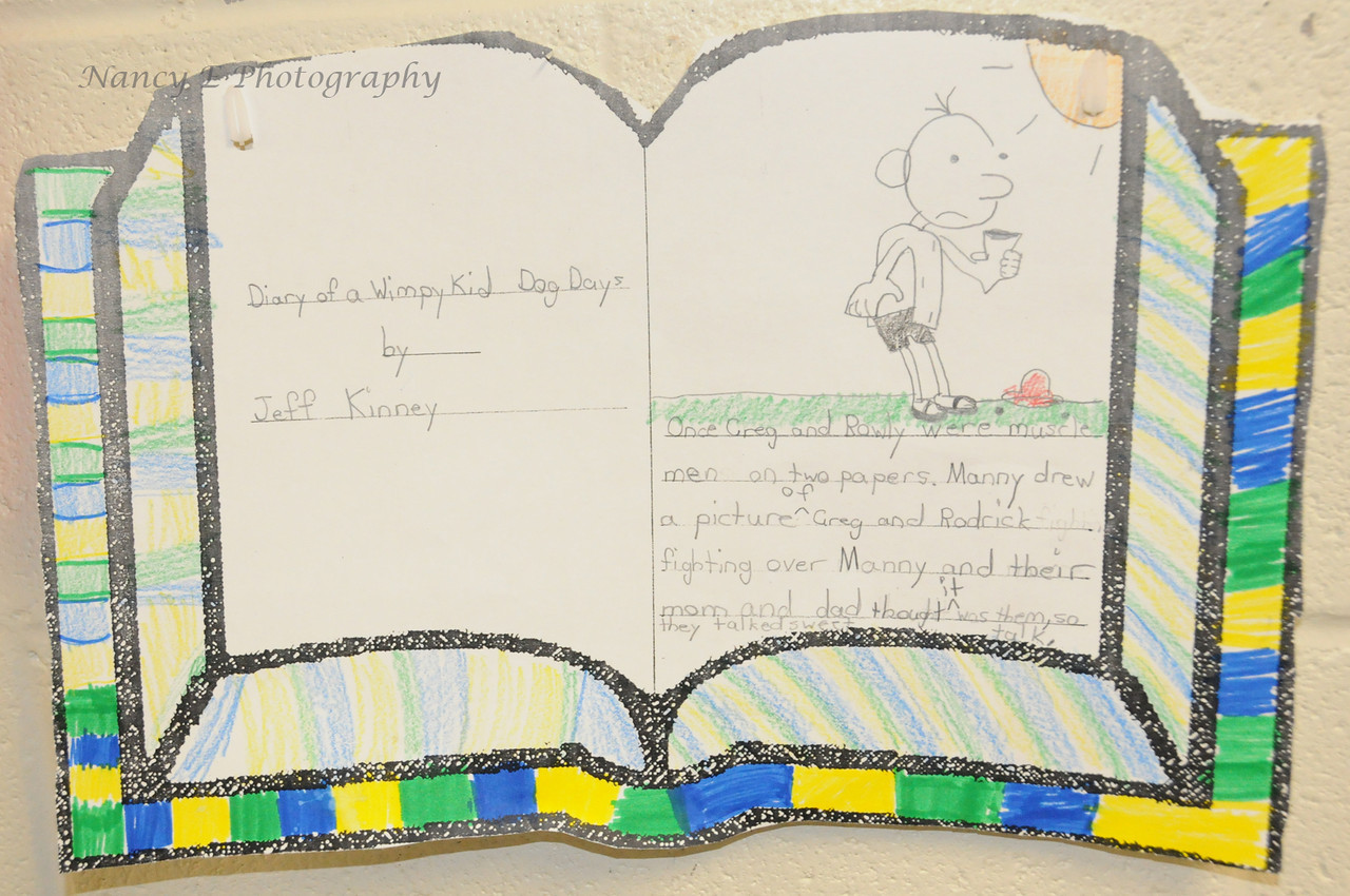 In the hall: Schuyler’s drawing of his book report “Diary of a Wimpy Kid” — this is his current favorite book series.