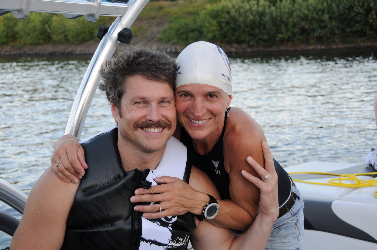 Last week we hosted these 2 – 21 year old coaches from England for Schuyler’s Challenger Soccer Camp in Amherst. I was nervous and Steve wasn’t sure we should take on the extra burden, especially since it fell within “treatment week” – but I pushed and thought it would be a good distraction, great for Schuyler and some good energy to have at the house. We showed up on that Sunday to pick up a coach, ended up hosting 2 coaches (Matt & Dom) and had an amazing week. I had a great routine going to get their breakfast & lunch stuff out in the morning – and then dinners each night. It was so fun for Schuyler! We got out on the boat twice and included Coach Marian from Brazil. What a great week. 🙂 Here is a link to some of my fave tubing shots for a “hair flip” post on my other blog. And they got used to me “bald” with my hat on and switching back & forth to my blonde “look” too. 🙂 I wore my bathing cap on the boat – boasting my Olympic Medalist look. 🙂 Here are some “ME” shots from our adventures on the boat (the ski photos Samantha took 2 weeks ago)….
