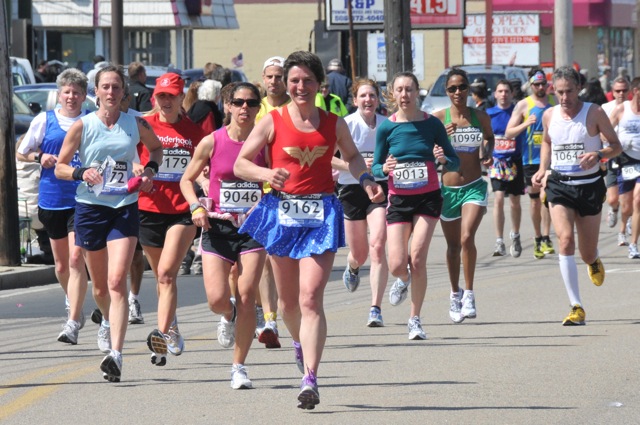 Not only am I now a cancer survivor of not quite 2 years since my diagnosis, but I survived this crazy Boston Marathon 2012 – in the “Extreme Heat Year” where the temps were pushing mid 80s and everyone was searching for shade . Pushing for a post cancer PR, my miles and training prior were in tune with a goal of 3:19. I really had the training behind me running all through the winter with a crazy 109 run streak and getting in 3 long runs too. It was tough out there. I had my Wonder Woman costume made by my sister, and the skirt was DRENCHED! The water tunnels, the water hoses from all the houses on the route, plus dumping the water from the aid stations on my body helped me to keep cool, and try to keep my pace. It was exhausting and I was bummed every time I looked at my Garmin to see the slower pace. My goal was adjusted many times, and I was happy to finish as well as I did. It has been a real tough one to recover from too — my legs still hurt after 3 days now. But proud to have finished my 8th Boston Marathon with a “BQ” for my age group and impressive time with the consideration of the crazy heat!