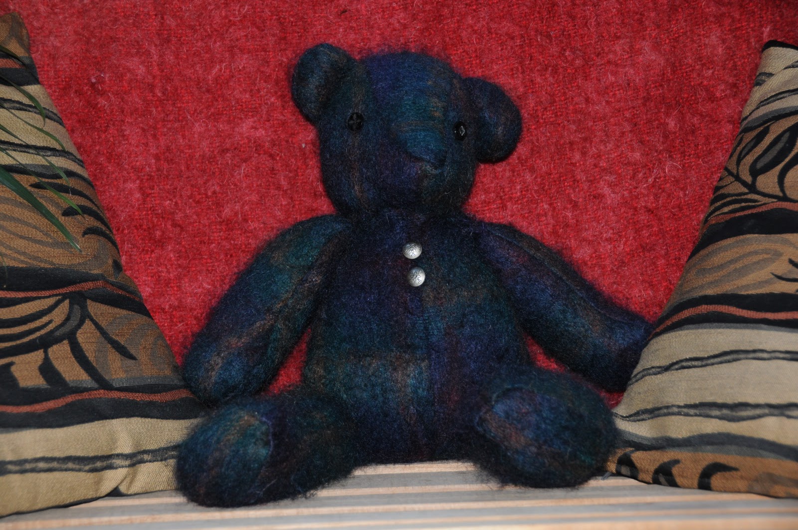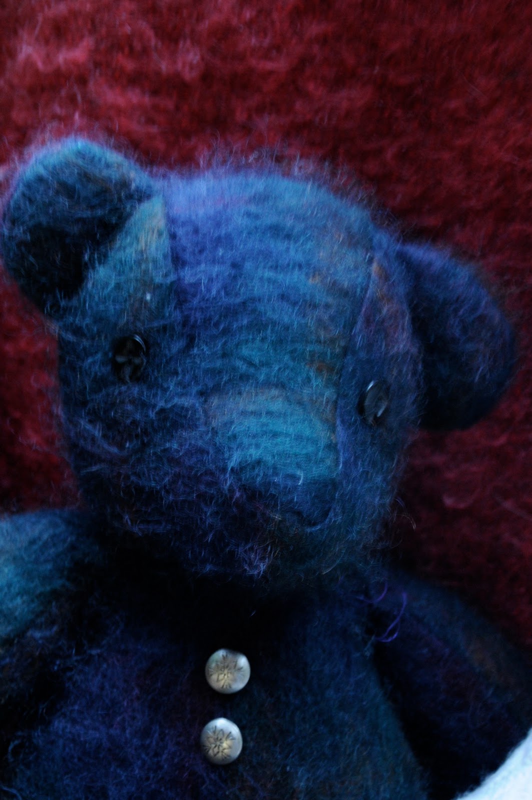 I took this idea home from the NH Craftsmen’s Fair and using a teddy bear pattern & my old collection of buttons and proceeded to take a favorite Mohair sweater (I bought the mohair in Kansas City) and and Irish cable knit sweater (one of my favorites from high school) to create Mo & MacKenzie Bear – the beautiful bear couple. Mo – for Mohair and MacKenzie because of her Irish cable knit appearance. 🙂
